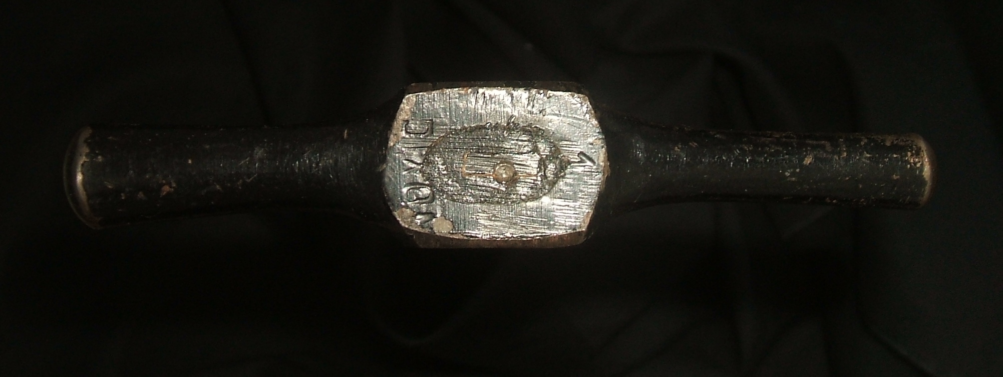 Dixon#8 embossing–Germany, handle small crack; 13oz; 7 1/8”, ½” domed round, 3/8” domed round; 13 ½” (too long, can be cut down for fit); $30