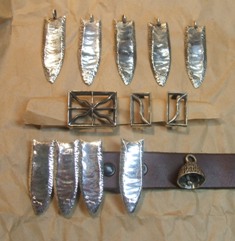 cast sterling: Decker Folsom spear point pendants (cast from Pete Bostrom Lithic Casting epoxy), ketoh style hand carved belt buckle 2 keepers, Folsom point belt buckle, bell prototype