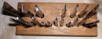 The Dixon #13 is a versatile stake. The dual knob ends allow forming many radius shapes – bracelets, cups, etc and each horn has different inside radii for forming curves on flat stock. You can use every surface of the knob ends to make dozens of shapes and curves. The shape of the horns also allows you to place the stake inside a vessel for forming. I used this stake the most, it is used and shows signs of use. See images for dings. I have cleaned and dressed this for my use using yellow tripoli finished to a dull polish. You are free to clean, dress and polish for your style. Approx. 12 inches tip to tip, 1 1/8 and 7/8 inch knobs. This is sold “as is”. The #13 can be installed in a nice tree stump if you do not have a large vise or anvil. You may notice the price is less of a discount compared to my other sales. This simply reflects the fact I will continue to use this stake if I don’t sell 🙂