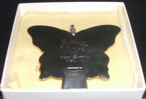 From my personal collection a Reed and Barton Silver Butterfly Pendant Whistle ca.1973 Holiday Ornament. This is distinguished from other examples because the original box is included as well as the original pouch. Collectors know original boxes are hard to find. Only one in stock (SOLD) $150 includes priority insured shipping continental US – other destinations please email for quotes.